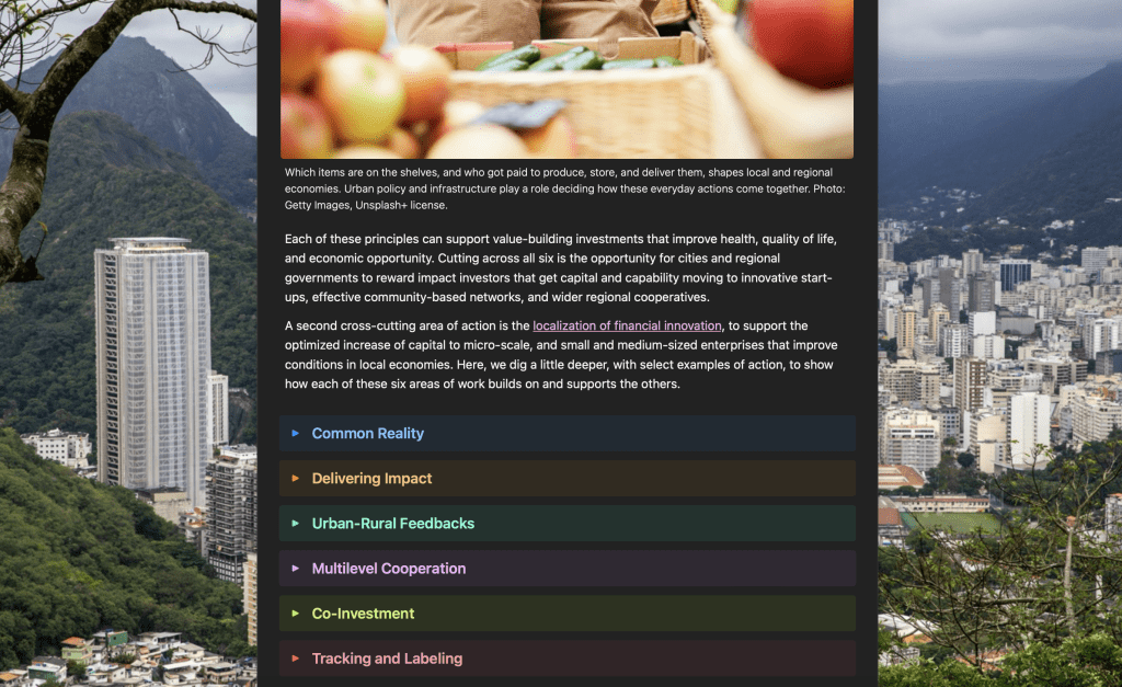 Each of these principles can support value-building investments that improve health, quality of life, and economic opportunity. Cutting across all six is the opportunity for cities and regional governments to reward impact investors that get capital and capability moving to innovative start-ups, effective community-based networks, and wider regional cooperatives.