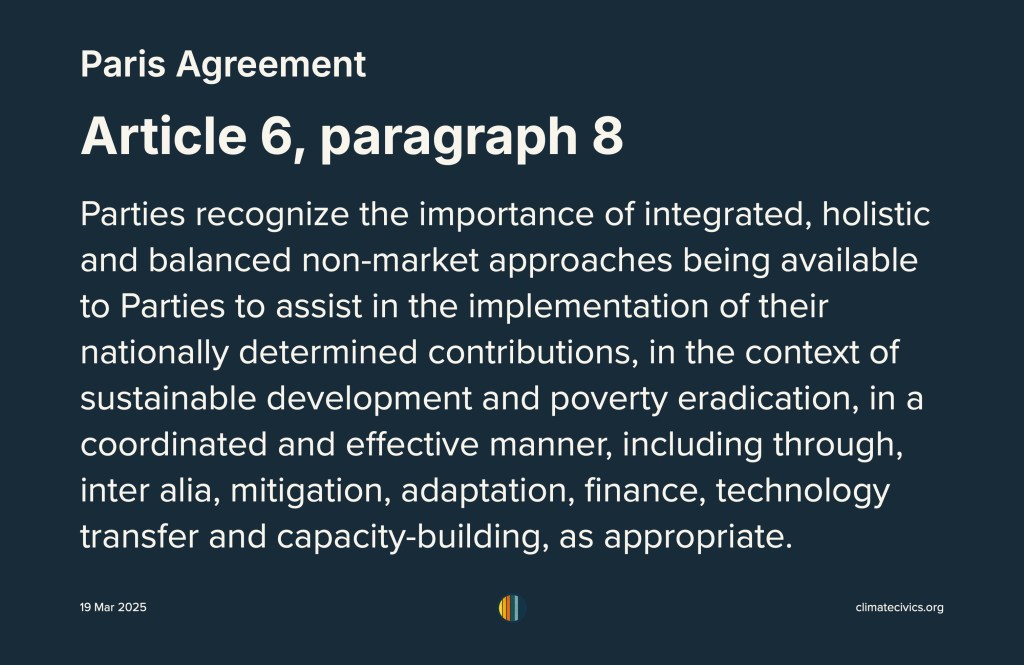 Article 6.8 of the Paris Agreement calls for international cooperation to accelerate climate action, across multiple dimensions, without emissions trading. It effectively invites multilateral agreements that mainstream climate action across the whole economy—advancing climate-smart trade and finance.