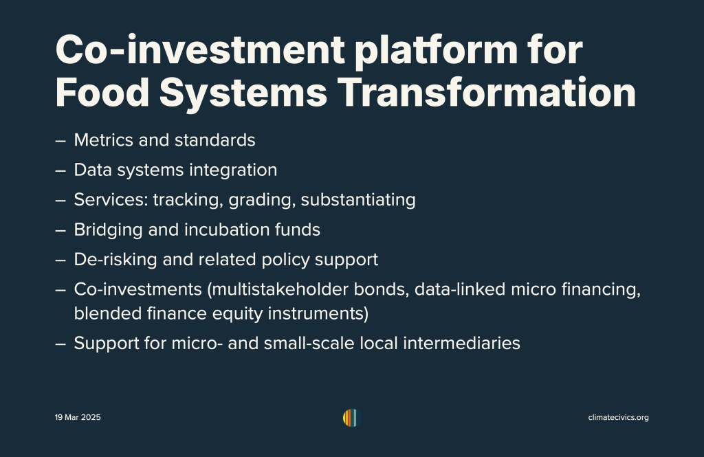 - A global co-investment platform for food systems transformation, aligned with climate goals and focused on revitalizing and diversifying marginalized, under-resourced, and unsustainable rural economies;